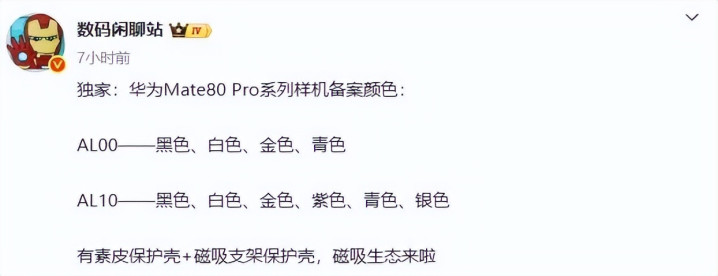 就在今日,博主@数码闲聊站 曝光了华为Mate 80 Pro系列样机备案颜色:AL00 系列包含黑、白、金、青四种配色,AL10 系列则是黑、白、金、紫、青、银六种配色。