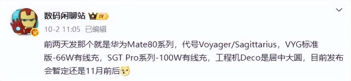 据月初@数码闲聊站 爆料,华为Mate80系列发布会暂定还是11月前后。