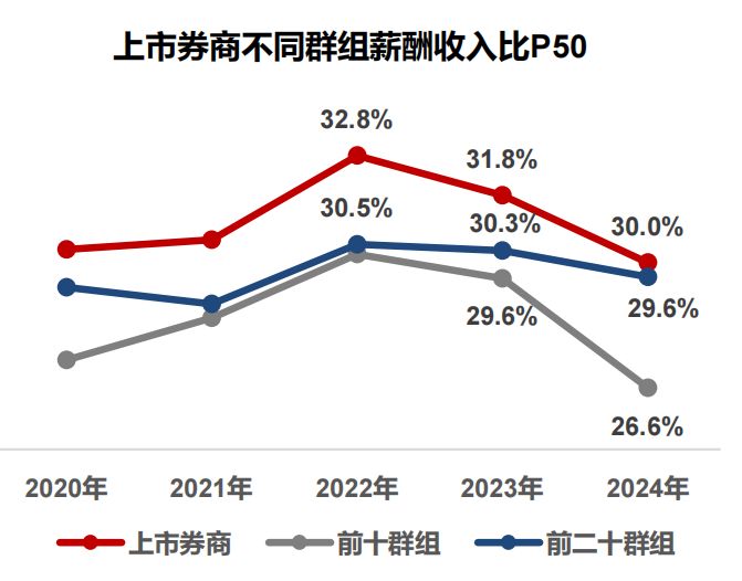 事实上,从薪酬收入比的角度来看,近年来,证券行业控薪力度确有加强趋势。据某咨询公司统计,从薪酬总额投入来看,2022年由于证券行业收入利润规模受到冲击,上市券商薪酬总额占收入比均值达到峰值,而近两年随着收入规模的回升和人员规模的管控,薪酬收入比均值持续下降,2024年前十、前二十上市券商薪酬收入比均值已回落到30%以下水平。